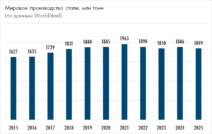 Всемирная ассоциация производителей стали (WorldSteelAssociation) представила пресс-релиз с итогами 2025 г., в котором отмечается, что общее производство стали в 70 странах мира в декабре 2025 г. составило 139,6 млн т. Показатель снизился на 3,7% к уровню декабря 2024 г. (144,5 млн т) и на 0,4% к уровню ноября 2025 г. (140,1 млн т). Всего за 12 месяцев 2025 г. совокупный объем производства составил 1 849,4 млн т. Результат на 2% меньше показателя января–декабря 2024 г. (1 886,8 млн т).